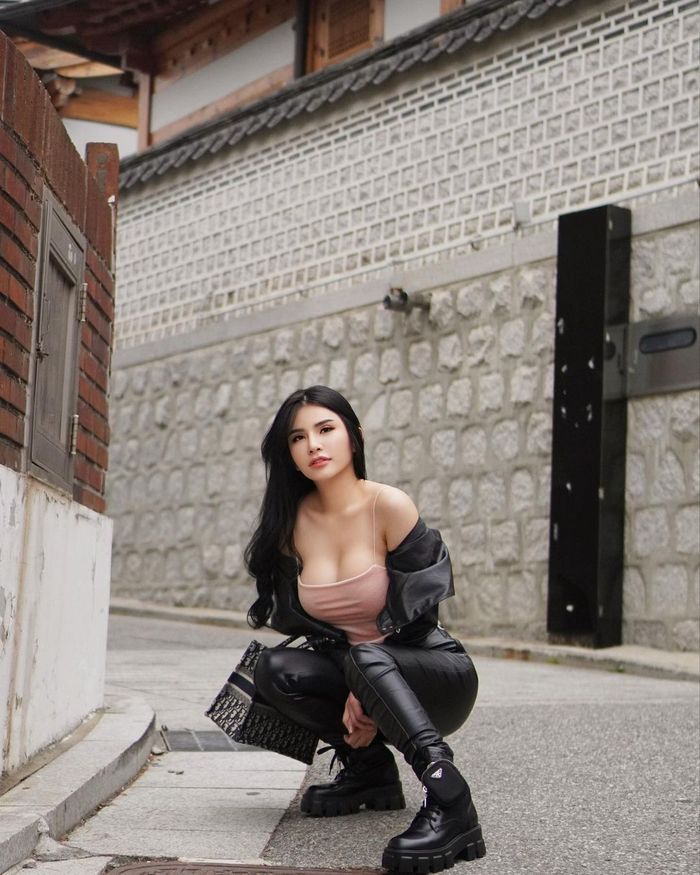 Dalam foto tersebut tampak Maria Vania berpose jongkok di Hongdae Street, Korea.