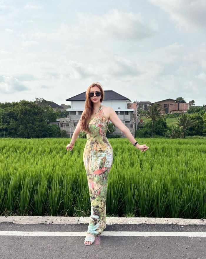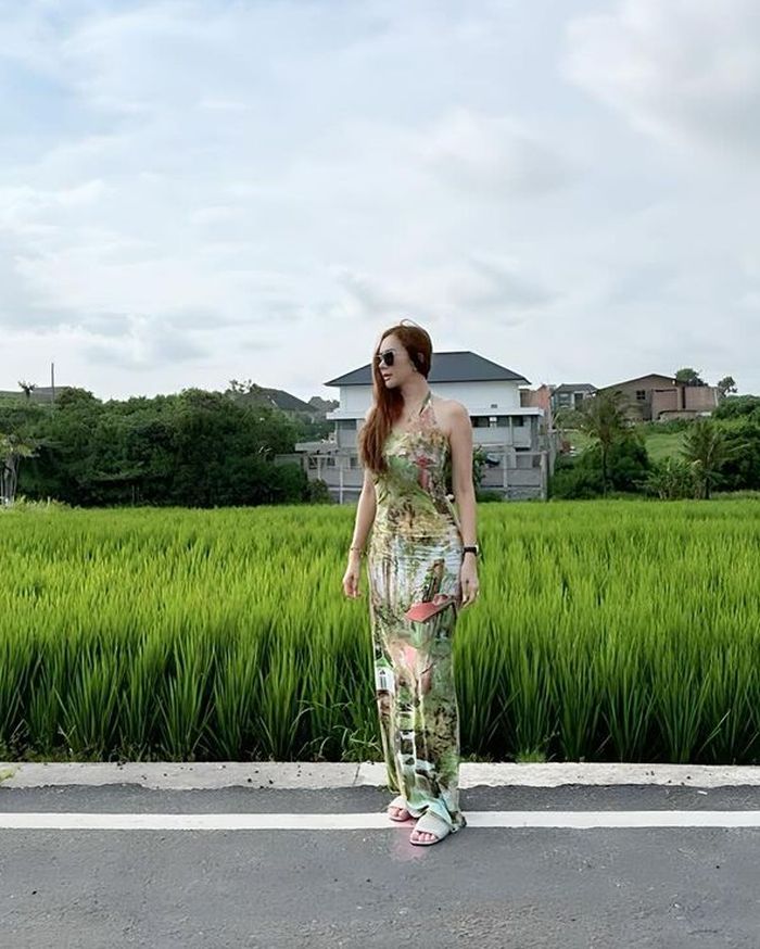 Dalam foto tersebut, terlihat janda 1 anak ini tengah berfoto dengan pemandangan hamparan sawah hijau yang indah.
